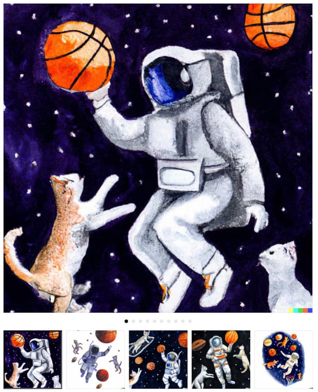 En The Guardian han publicado una reseña de una aplicación en fase de pruebas que genera imágenes a partir de frases usando inteligencia artificial. Por ejemplo “An astronaut playing basketball with cats in space in a watercolor style” generó: